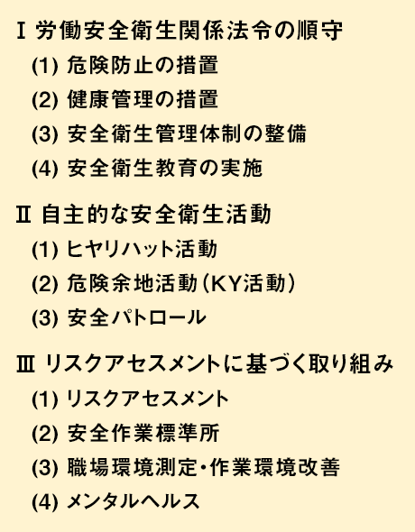 ゼロ災は、“部分最適化”だけでは達成できません。これまでの事故発生の教訓から、左図にある活動事項を積み重ねて全体として機能するよう努めています。